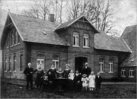 Theodor und Elisabeth Schumacher mit ihrer Familie vor dem Wohnhaus in Berge v.l.n.r.: Ernst, Hermine, Alois, Elisabeth Schumacher, geb. Lohbeck, Lisbeth, Liesel, Maria, Carl, Elisabeth Schumacher, geb. Middeke, Berta, Theodor Schumacher, Alwine, Franz
